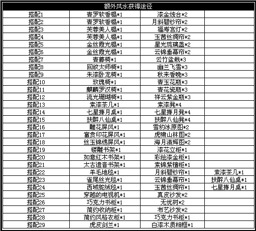 先说了,单纯只是为了风水去的,至于美观,不考虑在内,我记得我游戏里总有朋友问我,最新8级家具出了,要哪些东西才能组合好互不相顶的风水图,我总结了一下,如下